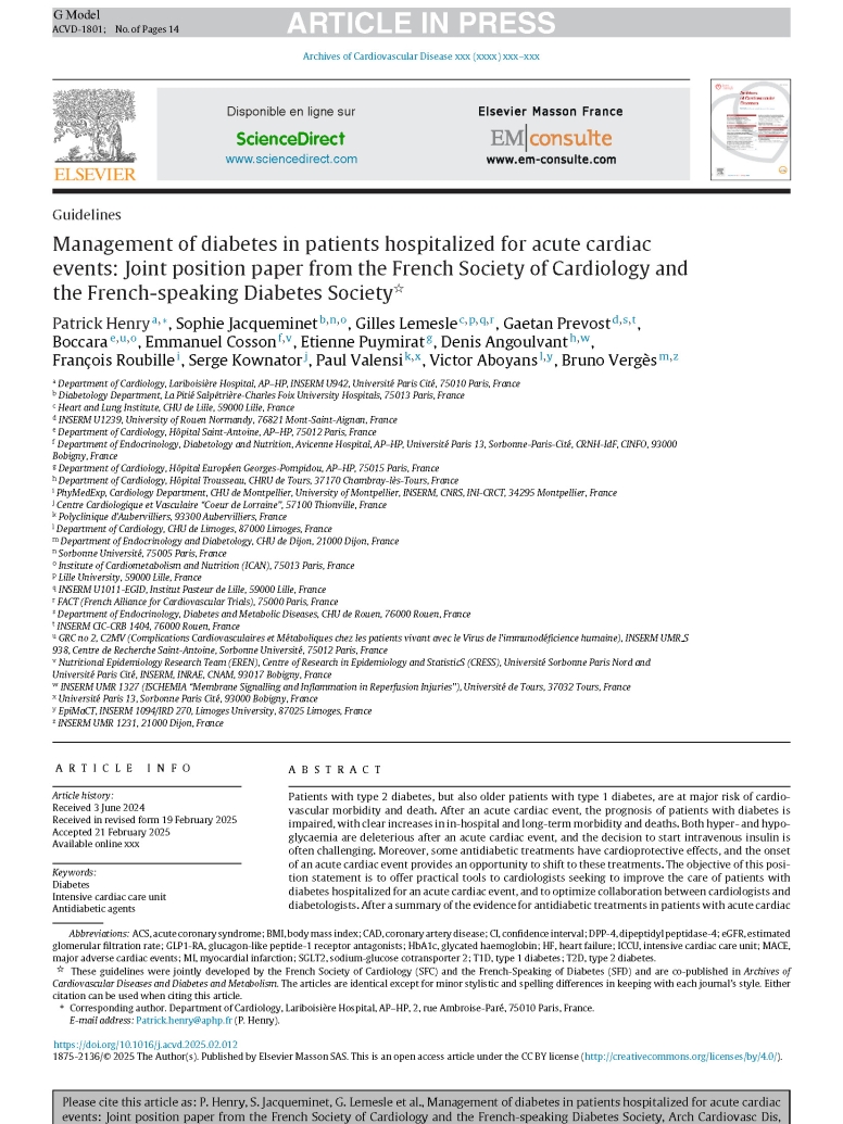 Consensus de la SFD/SFC sur la prise en charge du patient diabétique hospitalisé en cardiologie pour un évènement aigu